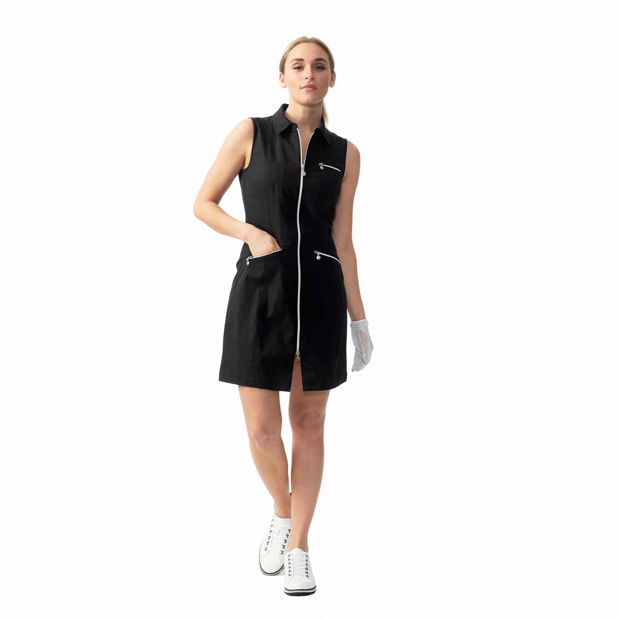 The Daily Sports Lyric Dress was designed to have you looking your best, from the course or the cart. This dress features a classic polo collar and a full front, two-way zipper for ease of use and accessibility. There are two front top loading zippered pockets and one chest pocket that provide plenty of storage space for balls, tees, and scorecards. The high-tech fabric is water resistant, quick drying, and breathable to keep you feeling and looking your best during your round.