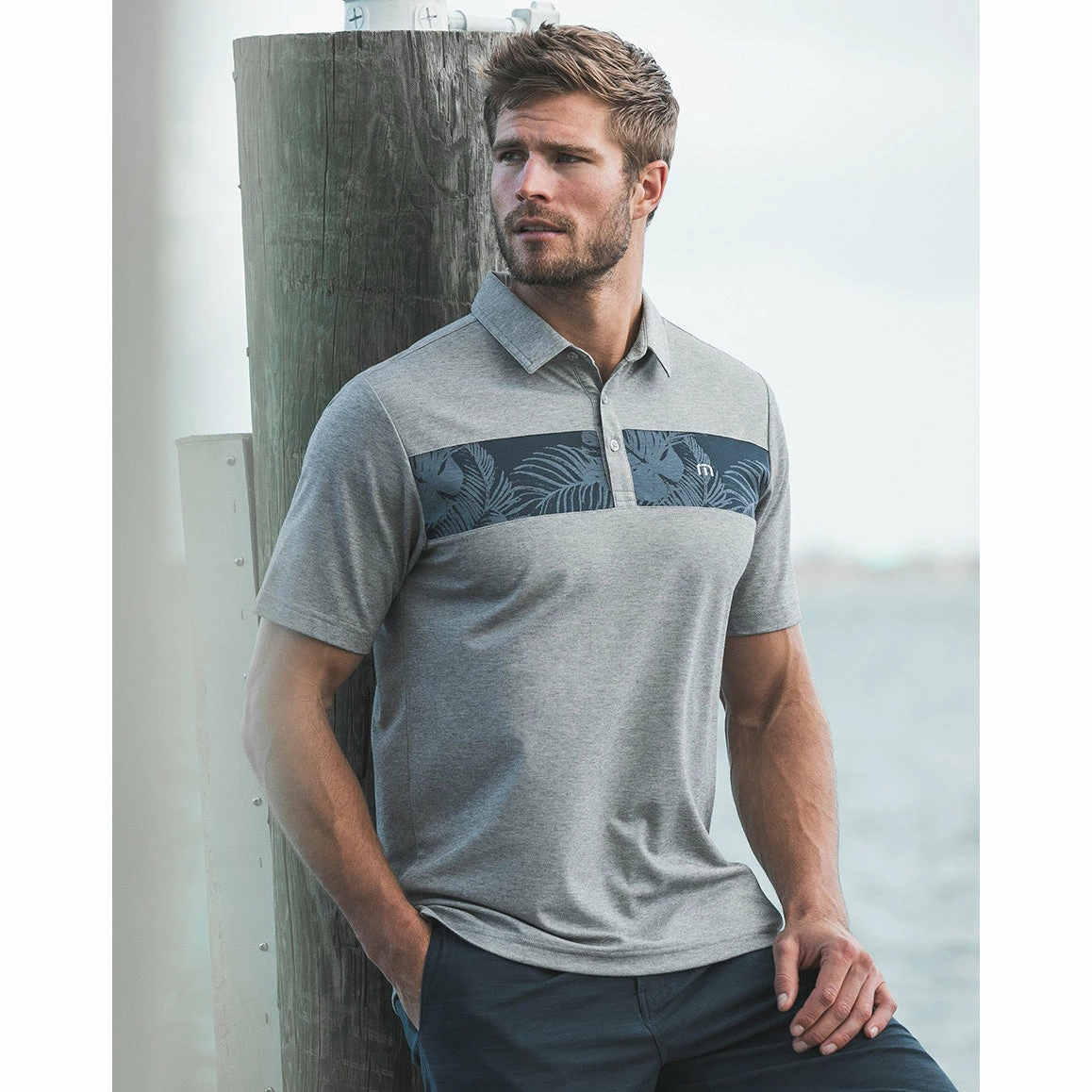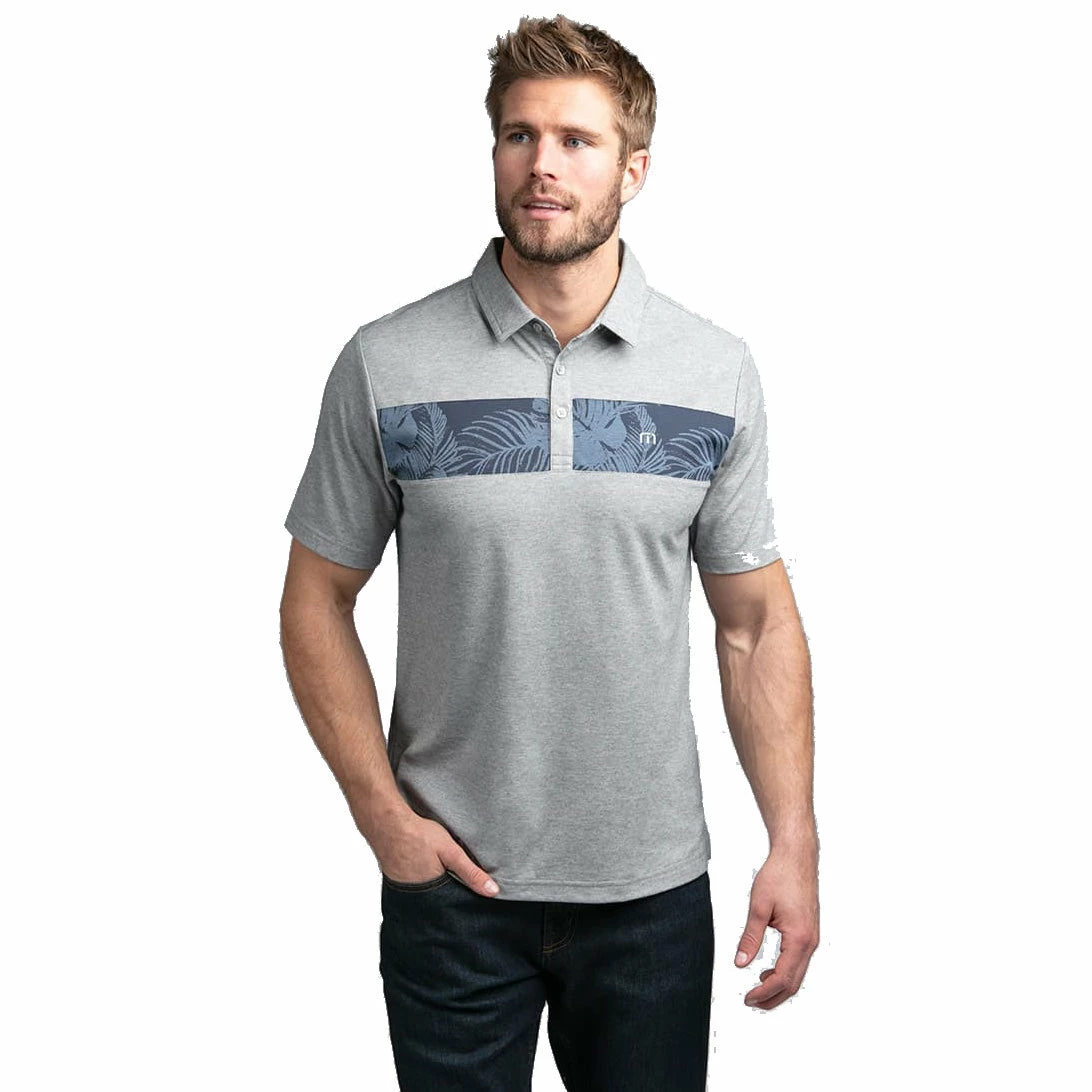 - Heather grey polo with floral and palm patterned chest stripe